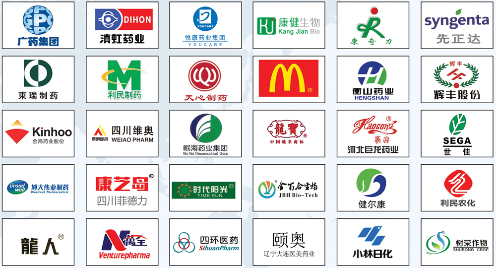 多年來(lái)公司始終以“誠(chéng)信、互惠、優(yōu)質(zhì)、價(jià)廉、快捷”的服務(wù)理念贏得了國(guó)內(nèi)外廣大用戶的信賴和贊譽(yù)。產(chǎn)品暢銷全國(guó)合作企業(yè)有浙江康恩貝、武漢健民集團(tuán)、好醫(yī)生集團(tuán)、四川科倫制藥、魯南制藥、魯抗醫(yī)藥、哈藥集團(tuán)、仲景宛西制藥、揚(yáng)子江藥業(yè)集團(tuán)、國(guó)藥集團(tuán)馮了性藥業(yè)、四川依科制藥、山西同達(dá)藥業(yè)、先正達(dá)作物保護(hù)、鹽城利民農(nóng)化、江蘇輝豐農(nóng)化、湖北百科亨迪制藥、藥都制藥集團(tuán)、黃石燕舞藥業(yè)、浙江遠(yuǎn)力健藥業(yè)、浙江佐力藥業(yè)、上海美優(yōu)制藥、輔仁藥業(yè)集團(tuán)、浙江莎普愛(ài)思藥業(yè)、杭州胡慶余堂藥業(yè)、廣西一力制藥、蘇中藥業(yè)集團(tuán)、白云山東泰商丘制藥、山東正大制藥、陜西漢唐制藥、河南金鴻堂制藥、源合盛(吉林)藥業(yè)、河北奧星制藥、上?,F(xiàn)代哈森(商丘)藥業(yè)、西安博愛(ài)制藥、廣東紅珊瑚藥業(yè)、山西皇城相府藥業(yè)、成都森科制藥、甘肅西峰制藥、悅康藥業(yè)集團(tuán)、河南羚銳制藥、山東綠葉制藥、江蘇岷海制藥、南昌立健藥業(yè)、四川維奧藥業(yè)、四川百草堂龍人藥業(yè)、珠海金鴻制藥、安徽先鋒制藥、廣東彼迪藥業(yè)有限公司、廣東百澳藥業(yè)有限公司、吉林四環(huán)醫(yī)藥、吉林華康藥業(yè)、黑龍江多多藥業(yè)、黑龍江全樂(lè)制藥、吉林博大偉業(yè)制藥、青海寶鑒堂制藥、南通精華制藥、山西奧邇藥業(yè)、山西千匯藥業(yè)、安琪酵母等。并出口亞、非、歐、美等三十多個(gè)國(guó)家和地區(qū)。